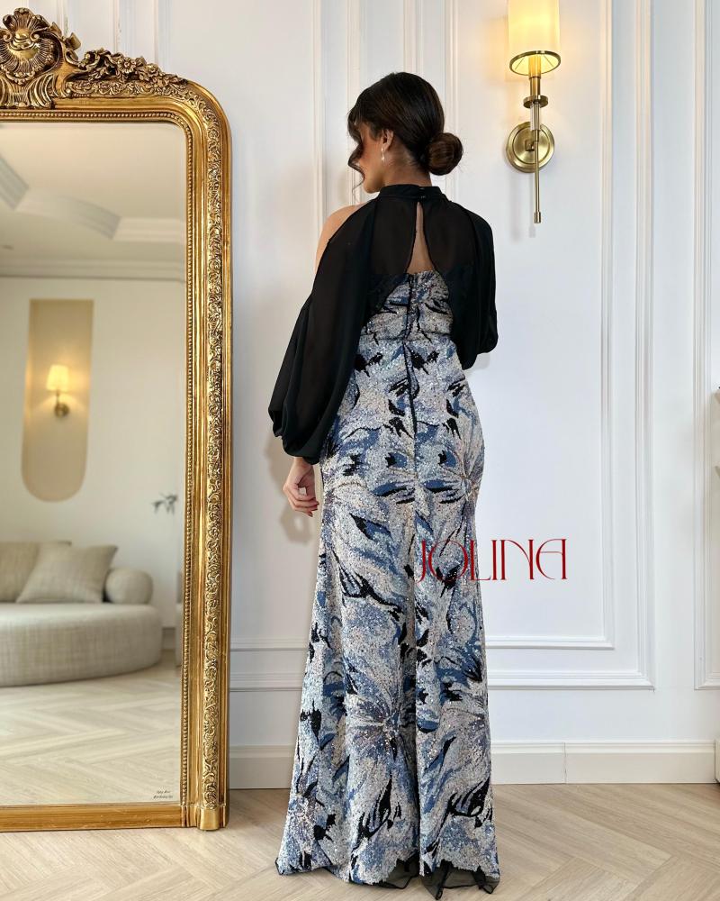 فستان سهرة مطرّز بتدرجات الأزرق مع جاكيت أسود أنيق