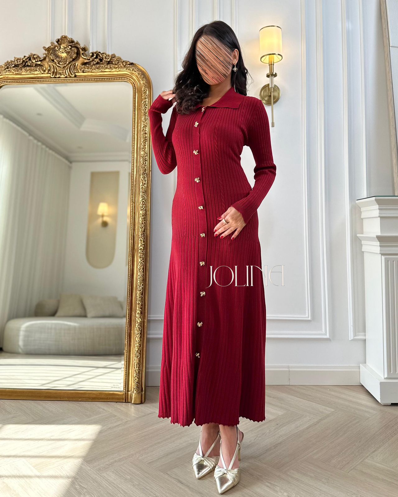 فستان أحمر طويل بأزرار ذهبية