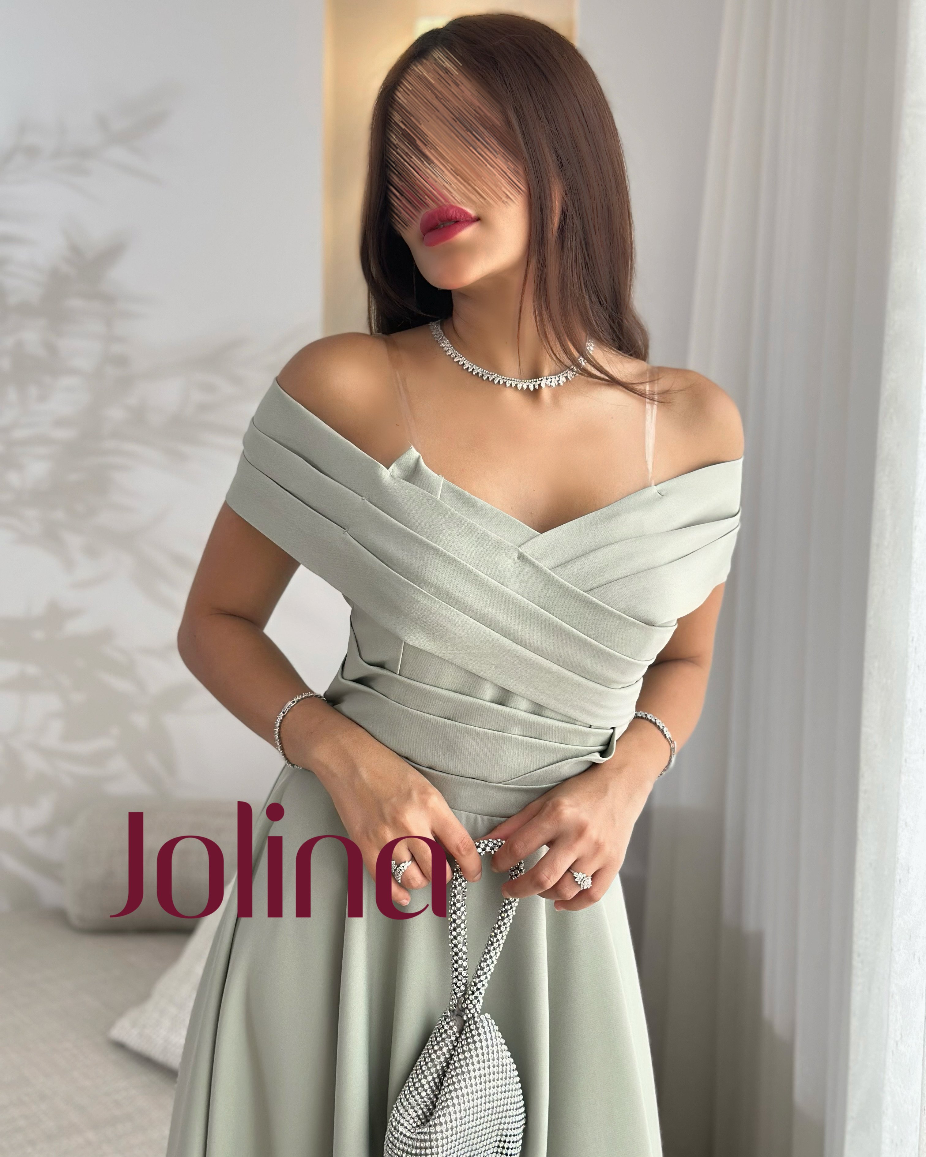 فستان نسيم مينت Mint Breeze باللون الأخضر الفاتح ينساب برقة على الجسم كنسيم الصباح، بياقة Off-shoulder وتصميم ملفوف عند الصدر يبرز الأنوثة برقي وانسيابية طبيعية. كل تفصيلة مطرزة بعناية، كما تروي جولينا Jolina روح الفخامة.