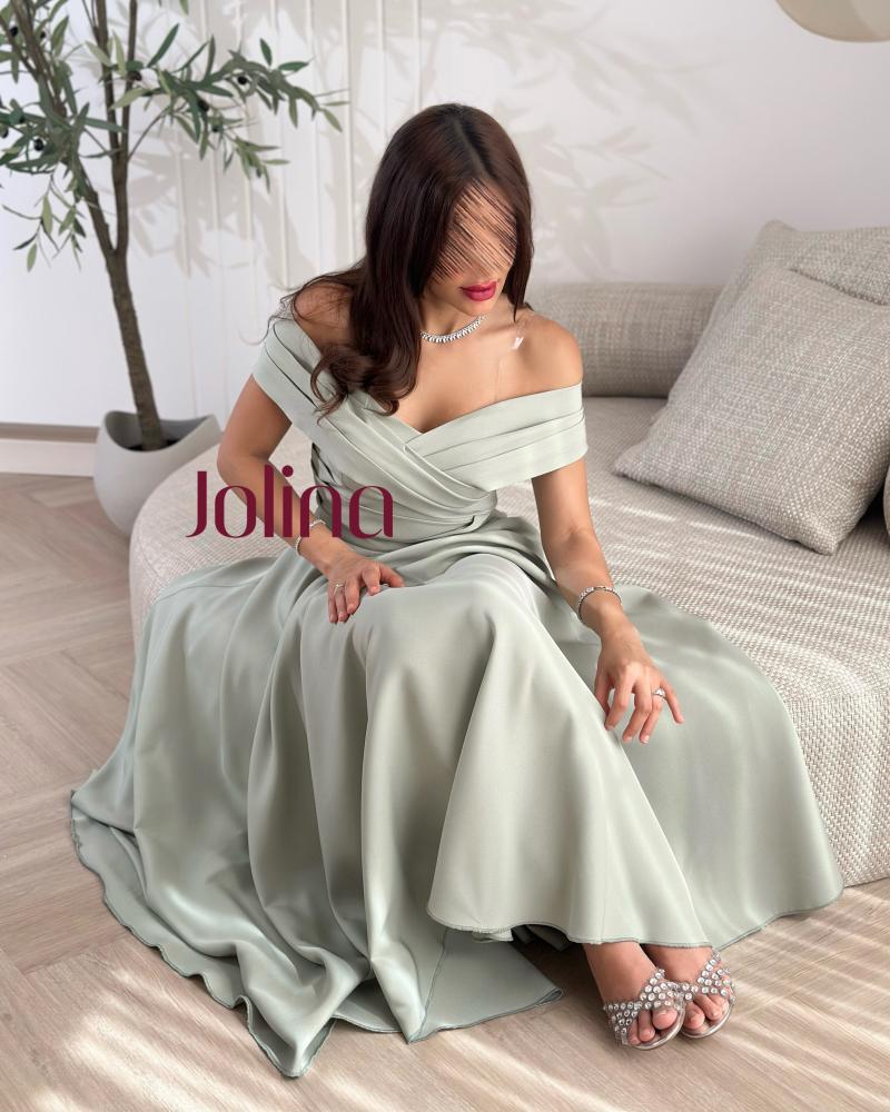فستان نسيم مينت Mint Breeze باللون الأخضر الفاتح ينساب برقة على الجسم كنسيم الصباح، بياقة Off-shoulder وتصميم ملفوف عند الصدر يبرز الأنوثة برقي وانسيابية طبيعية. كل تفصيلة مطرزة بعناية، كما تروي جولينا Jolina روح الفخامة.