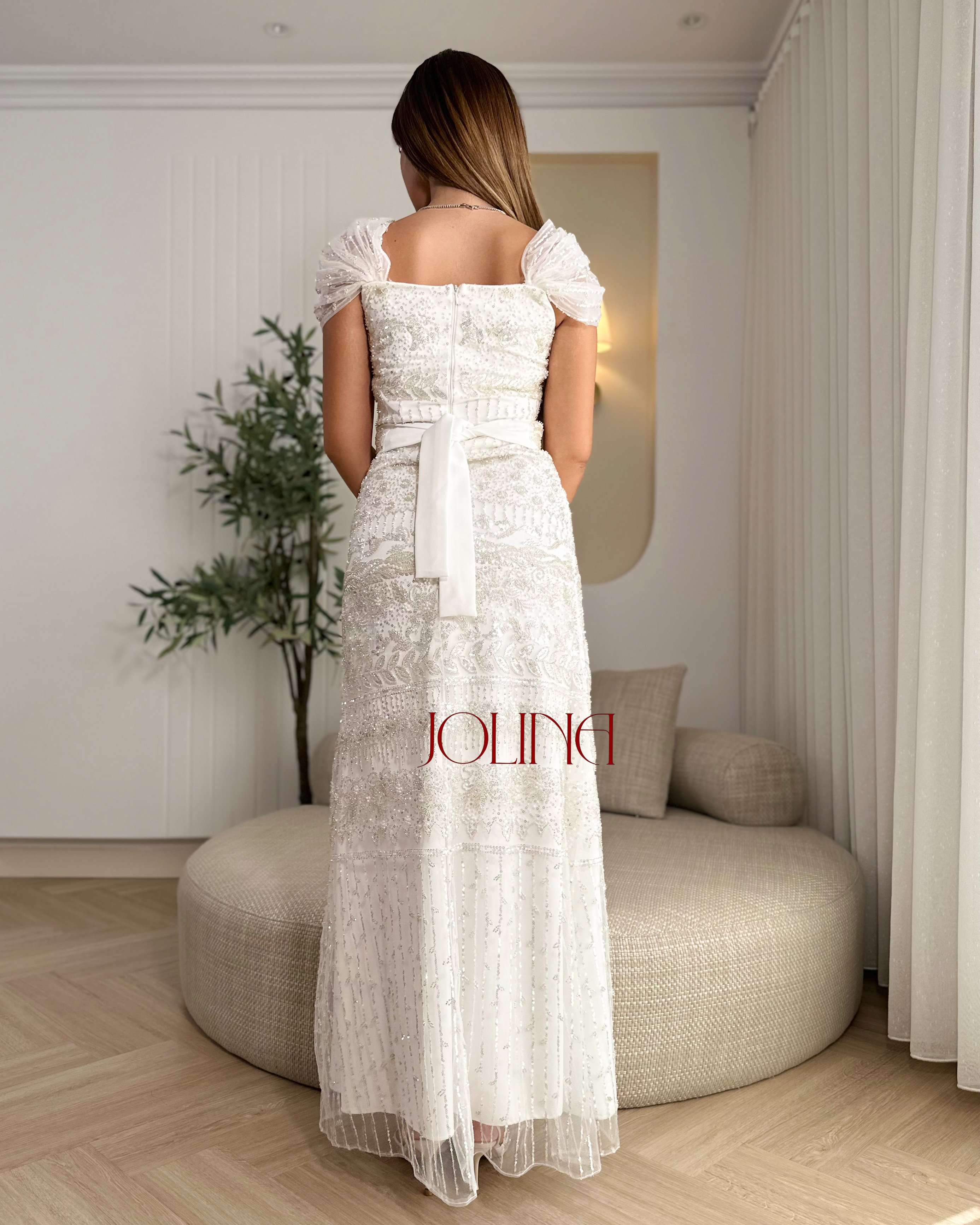 فستان سهرة أبيض مطرّز بالكامل