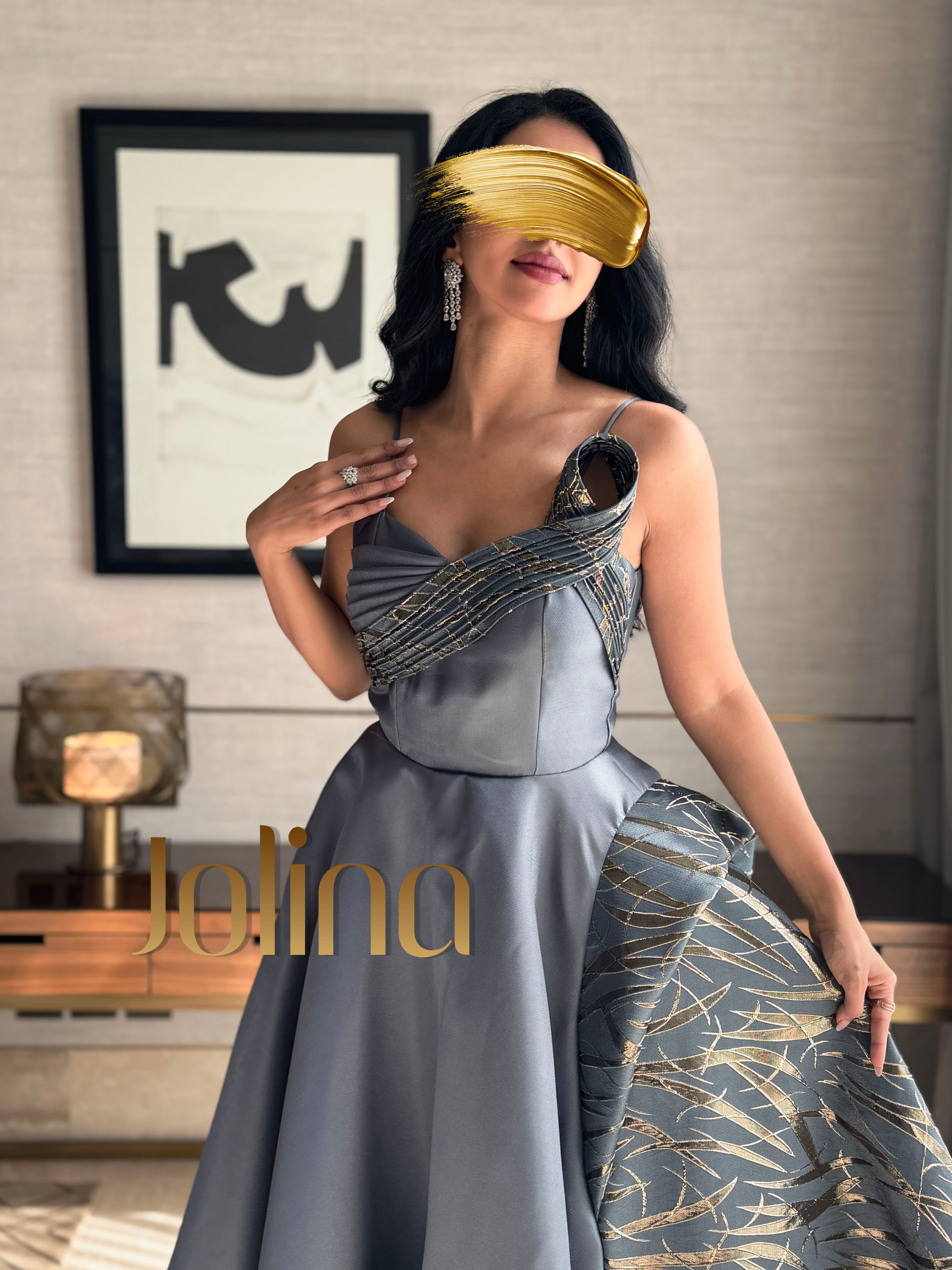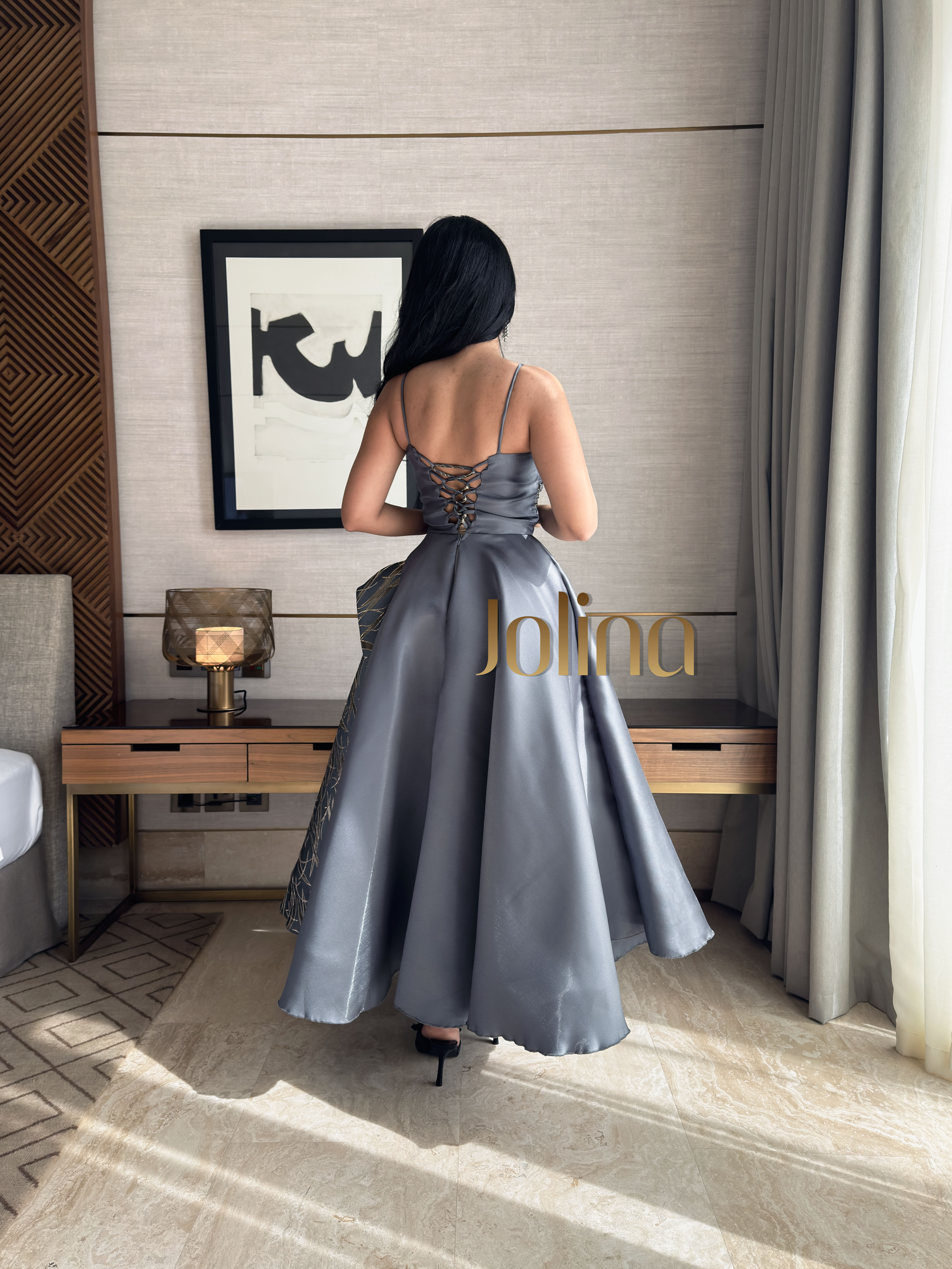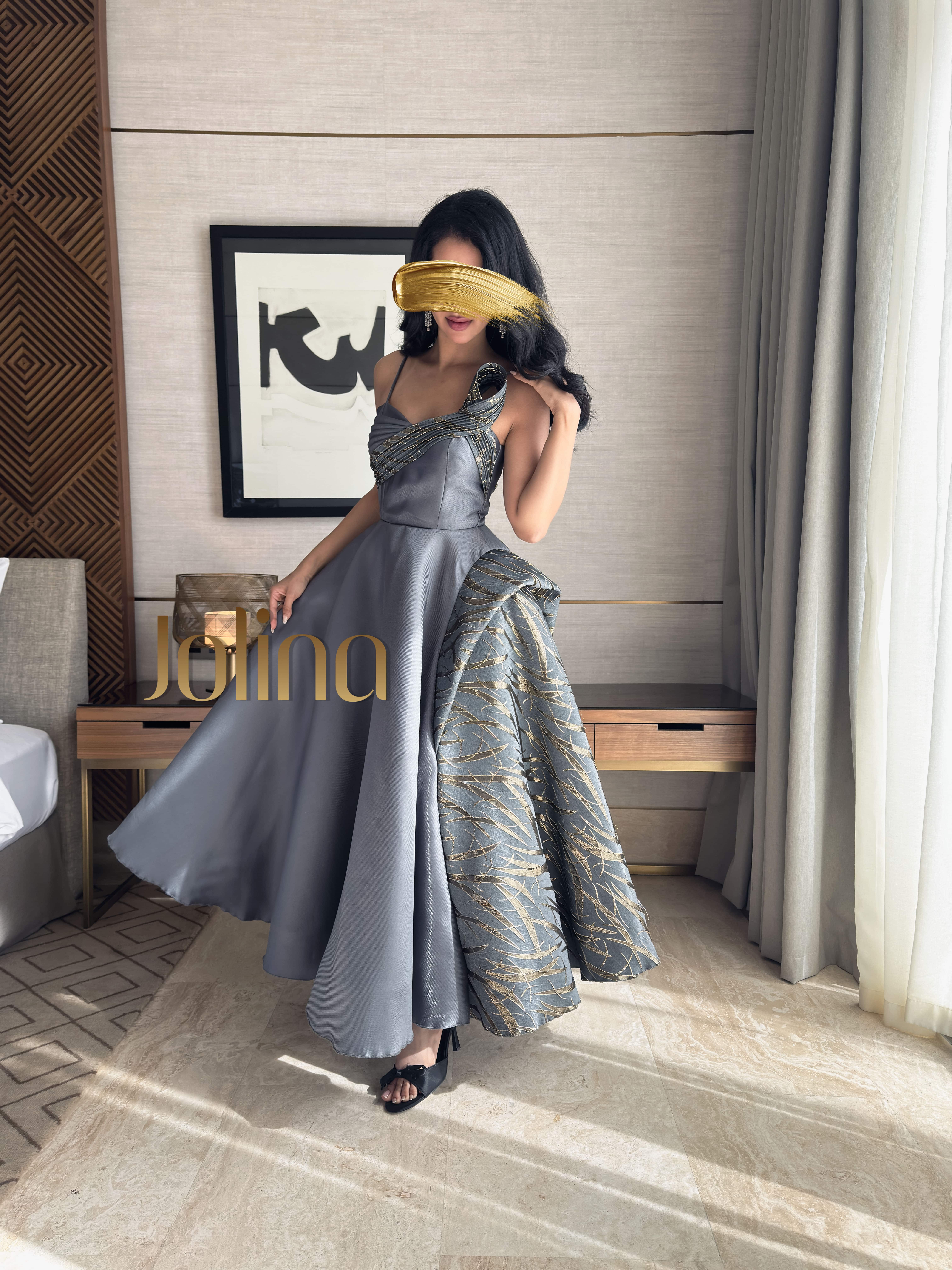 فستان سهرات راقٍ بلون رمادي وتطريز ذهبي فني.