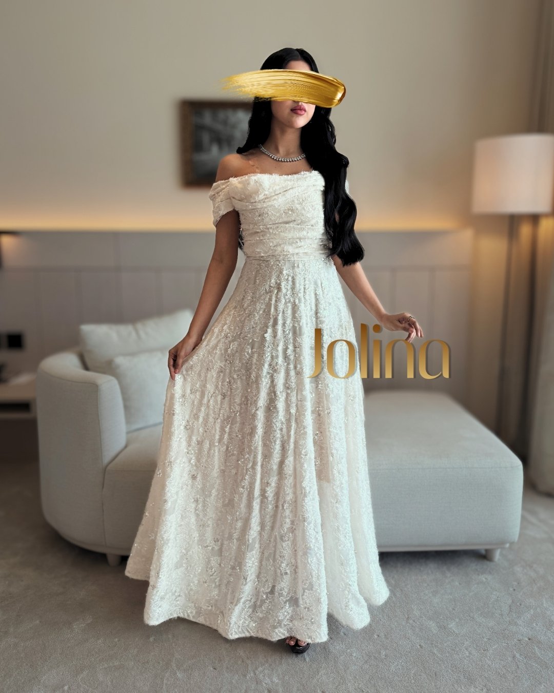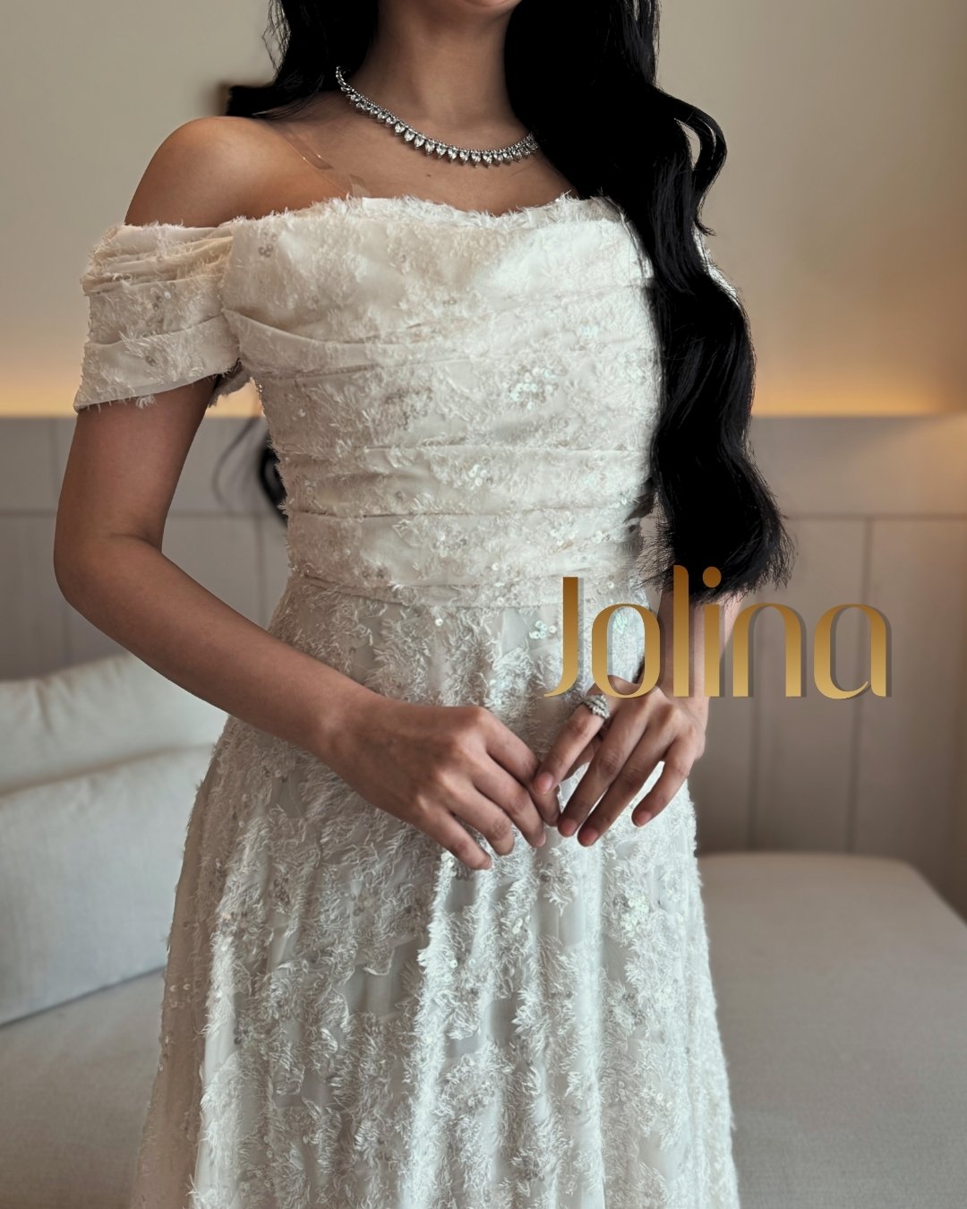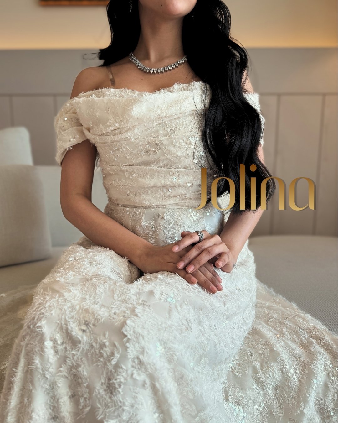 تصميم Off-Shoulder بكسرات أنثوية وقصة لفّ من الأسفل، يجمع بين الأناقة الخليجية والفخامة الملكية، مثالي لزواجات، خطوبات، وجمعات السهرات.