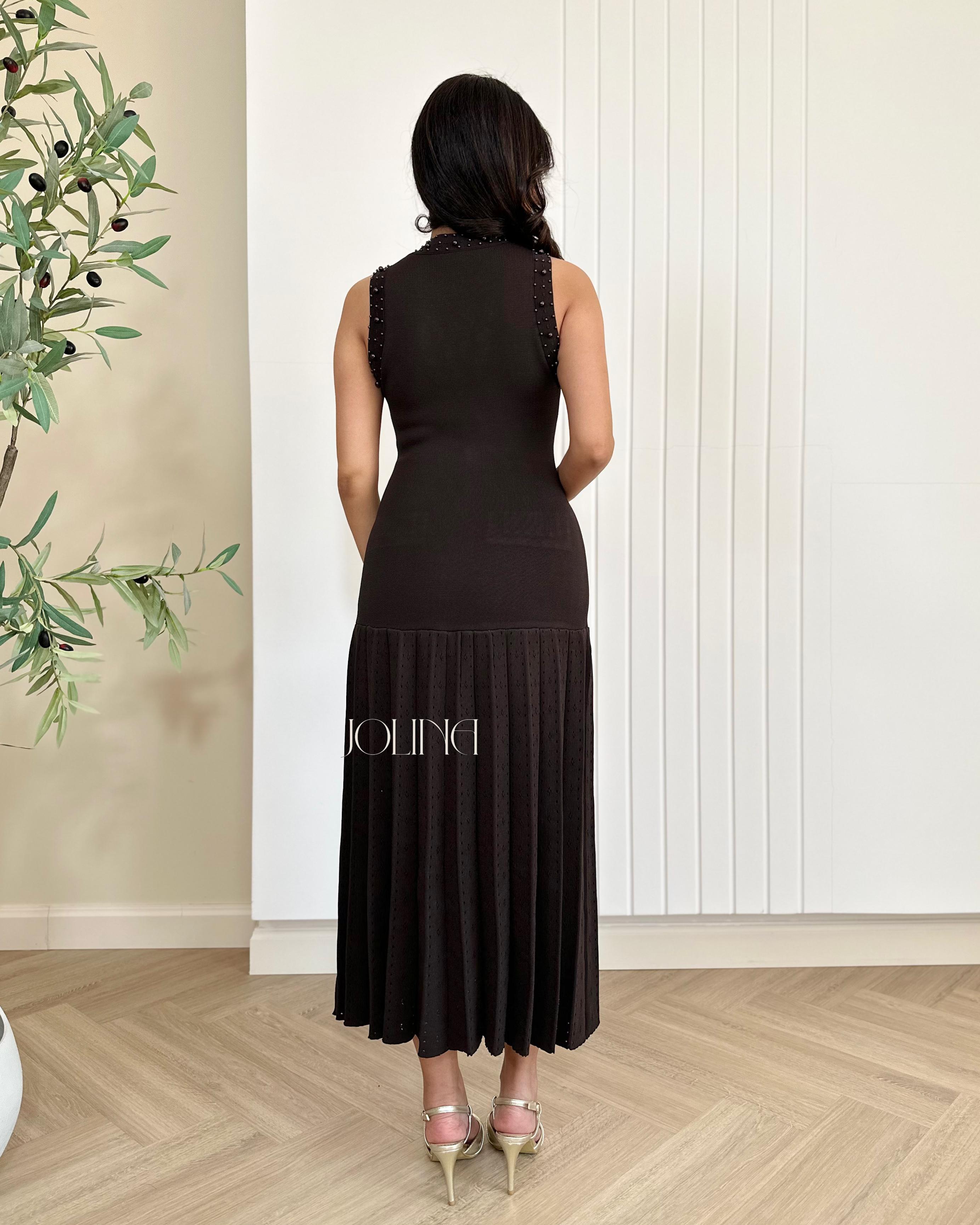 فستان بني أنيق بدون أكمام بتفاصيل لؤلؤية