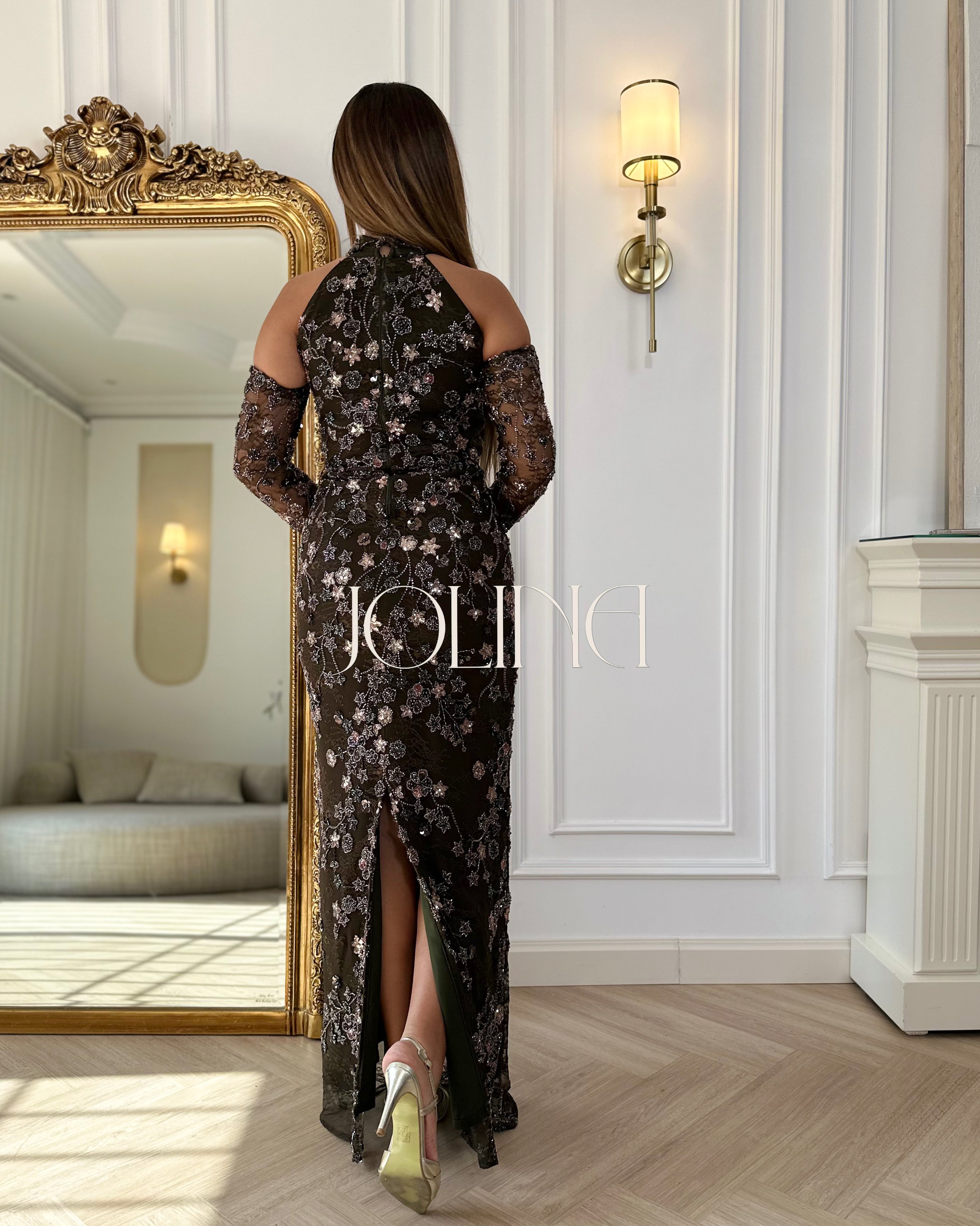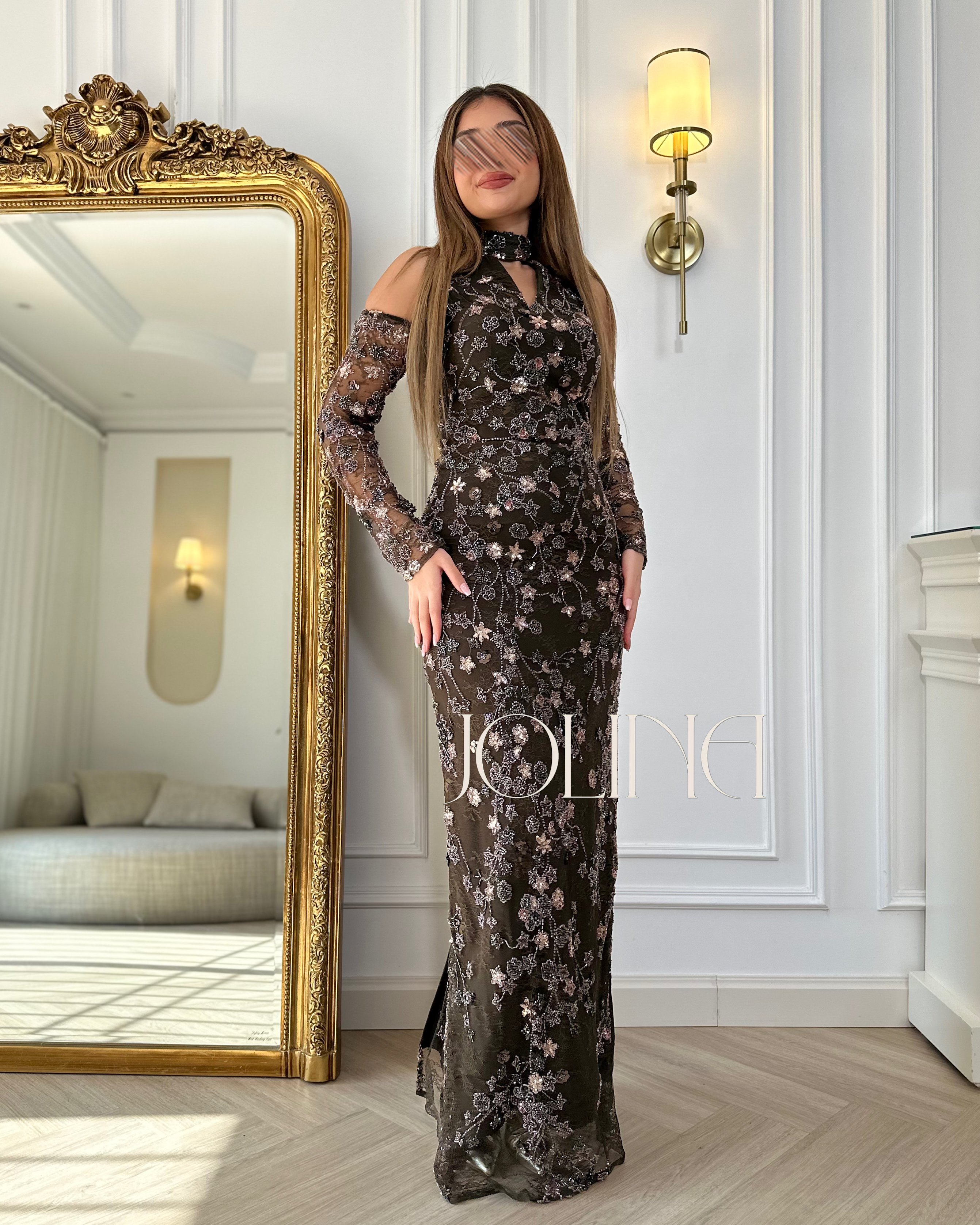 فستان بني مطرز بالكامل بتصميم كتف مكشوف