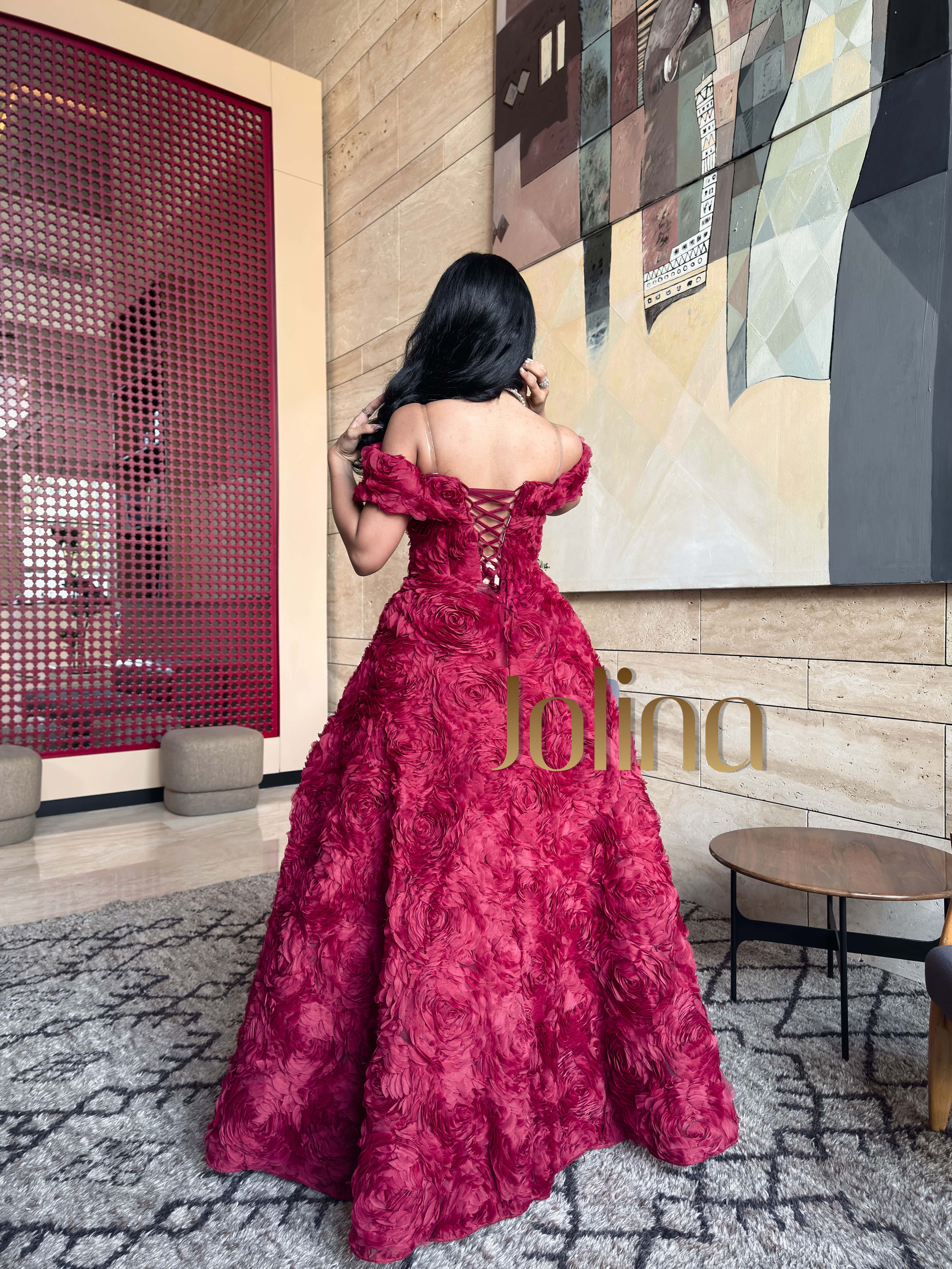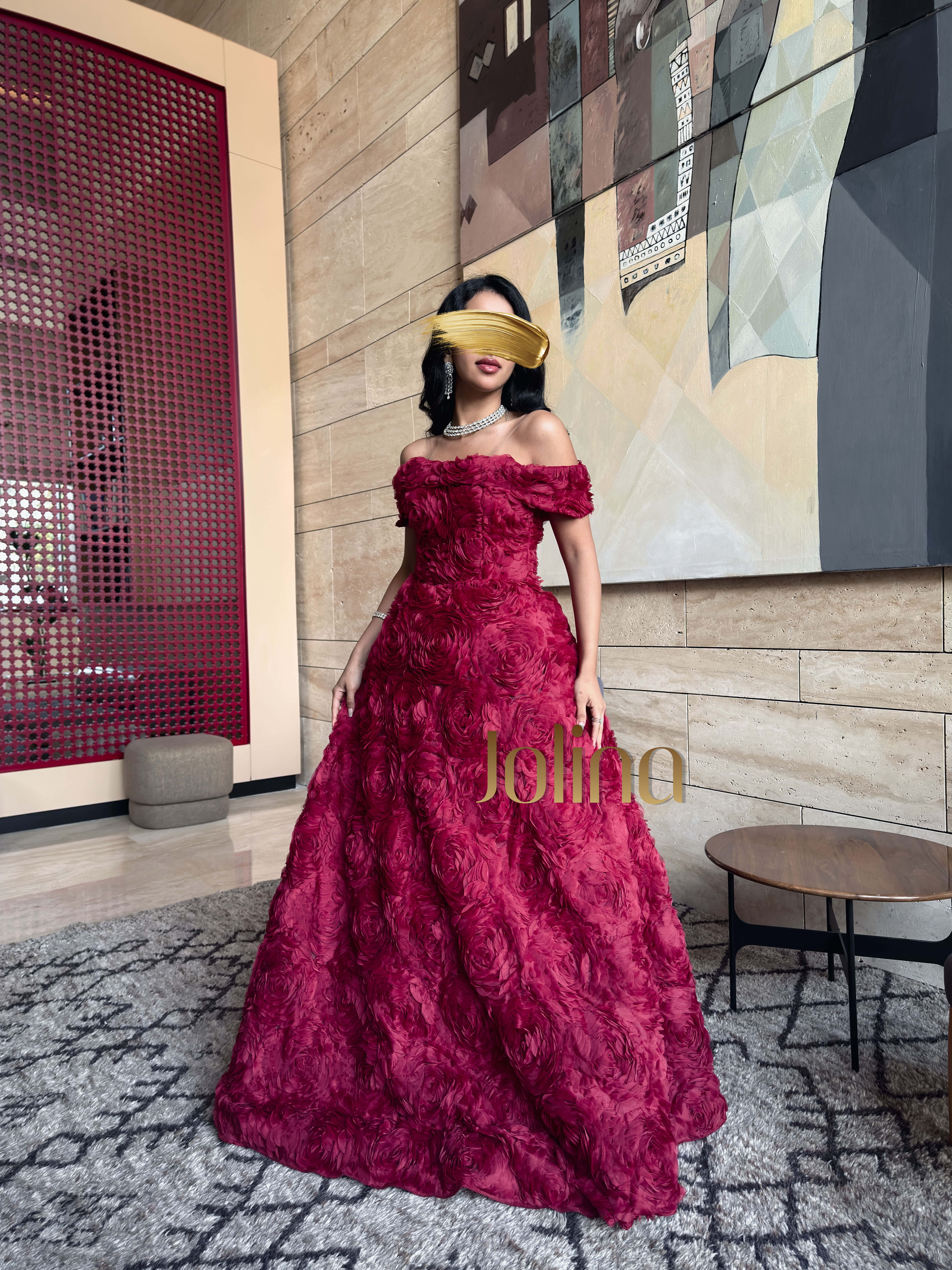 فستان لؤلؤ Velvetine بلون عودي دافئ وقماش مورد فاخر، تصميم مكشوف الأكتاف بقصة واسعة ومنفوشة يفرض حضوره برقة ويمنحك إحساسًا ملكيًا يبقى في الذاكرة.