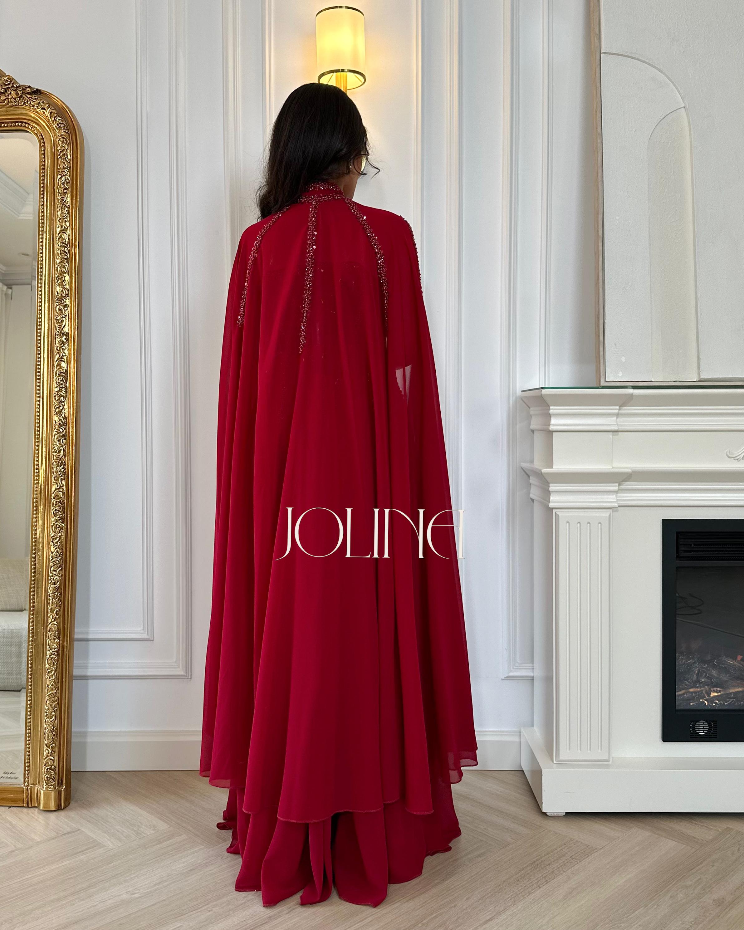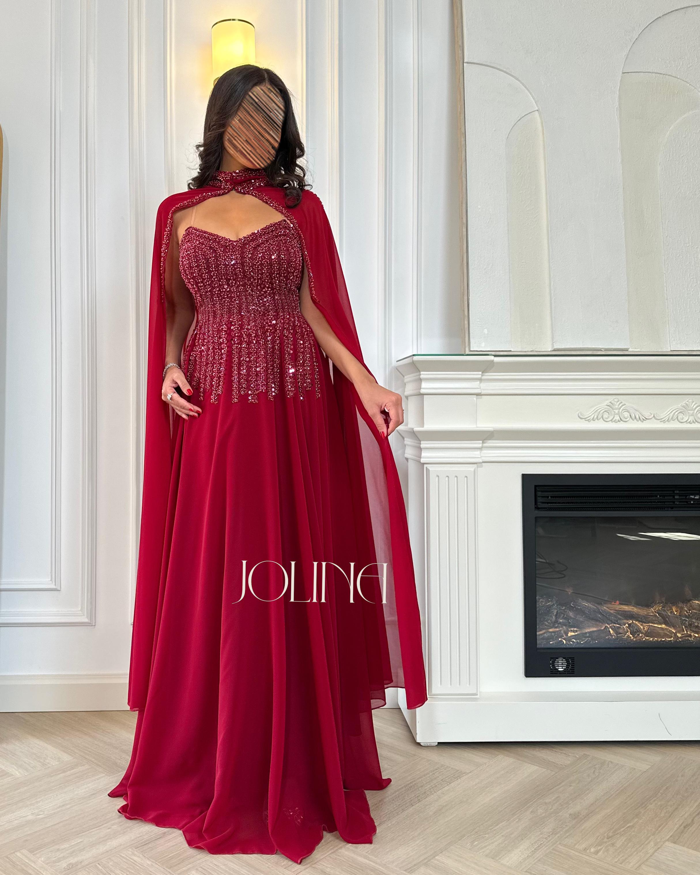 فستان سهرة أحمر فخم مطرز بالترتر مع كاب