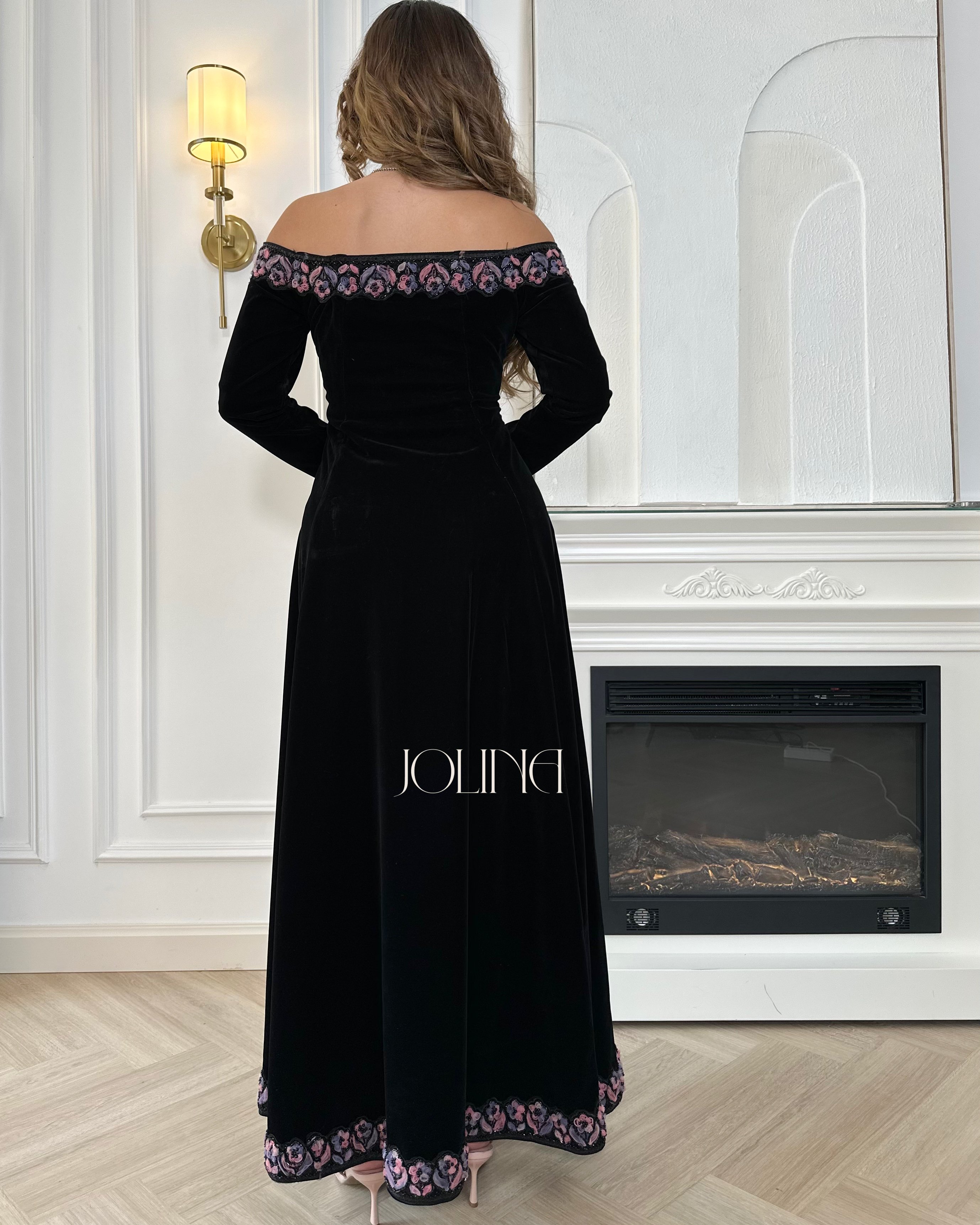 فستان مخمل أسود أوف شولدر بتطريز وردي