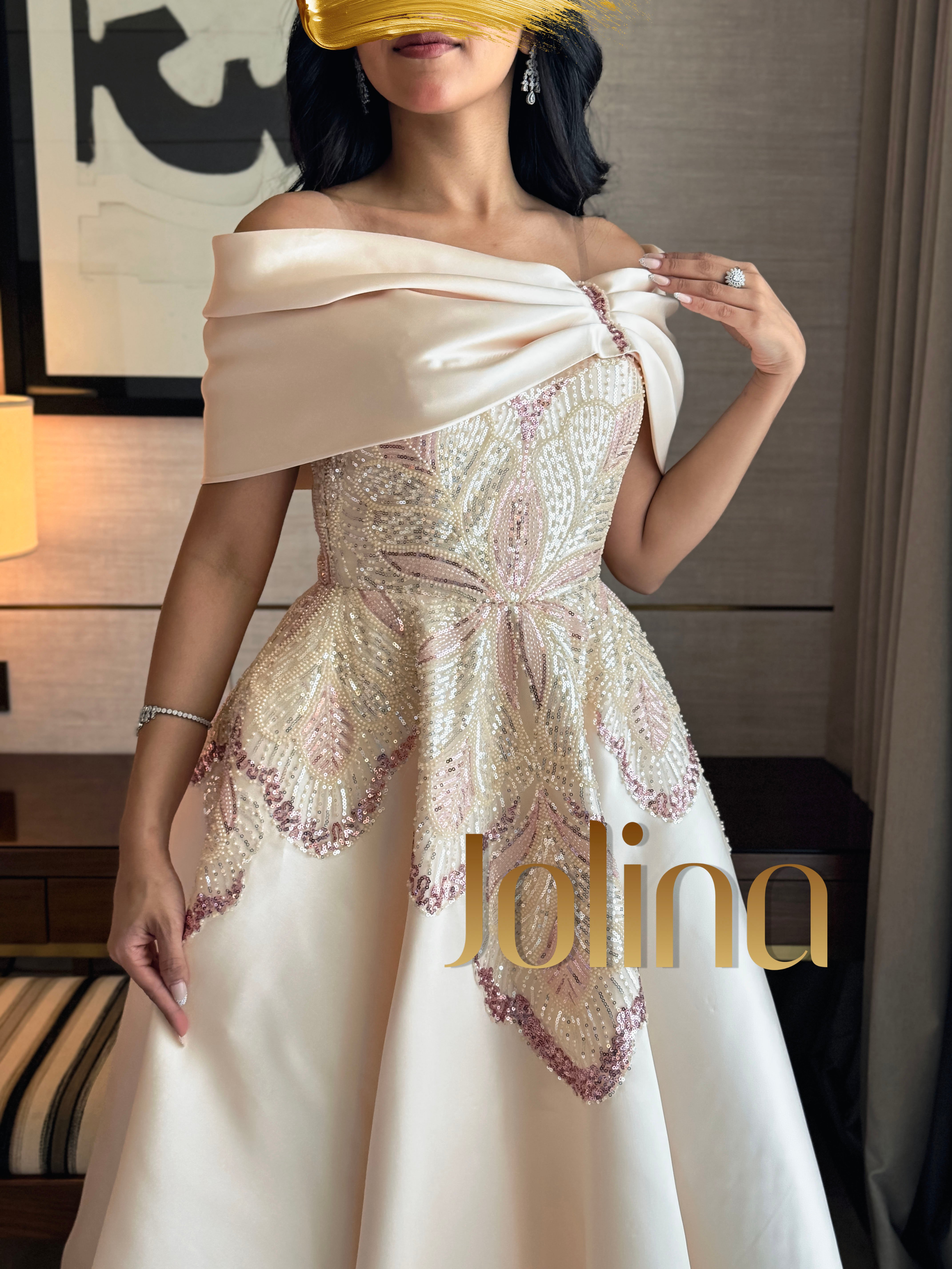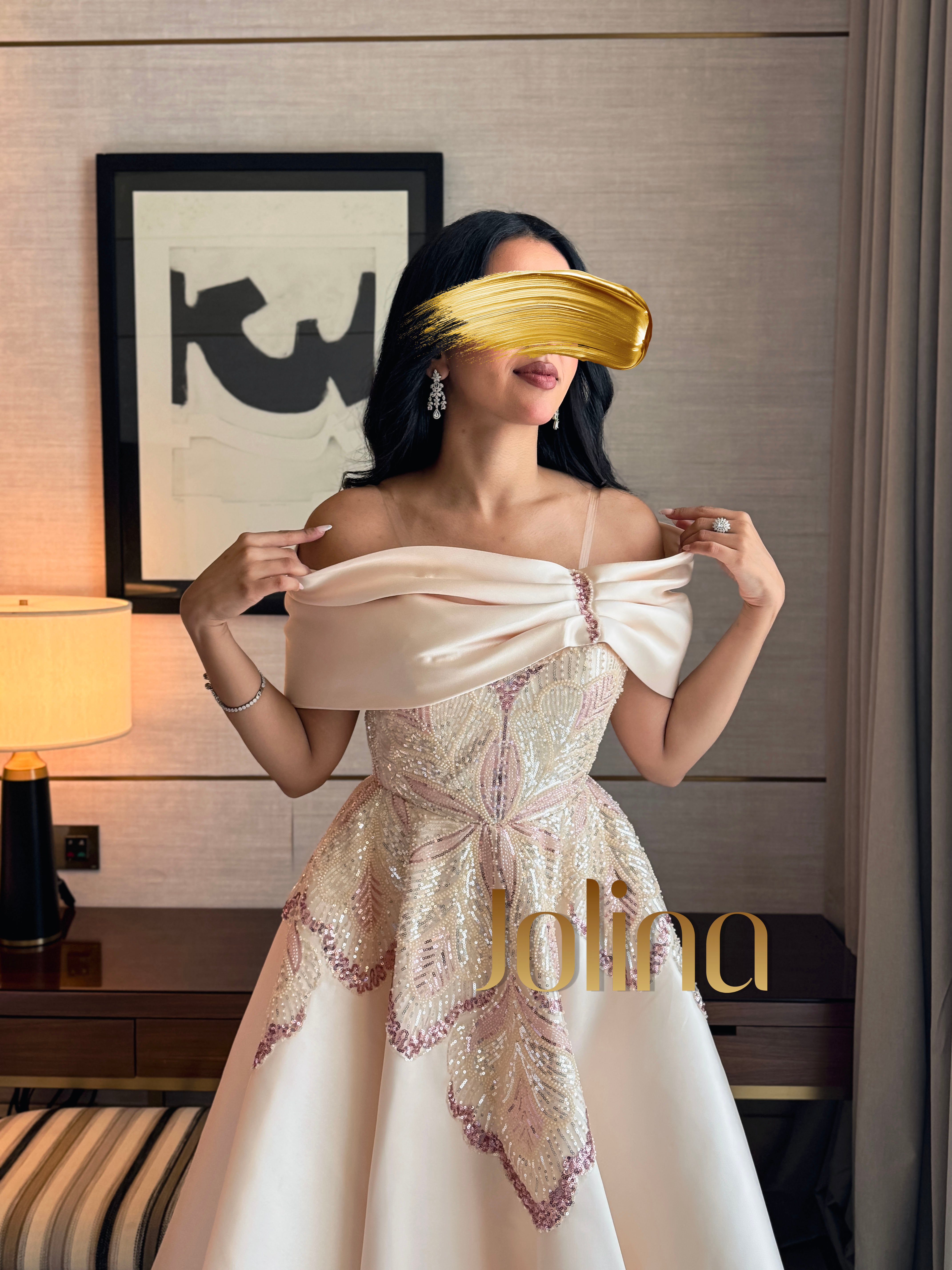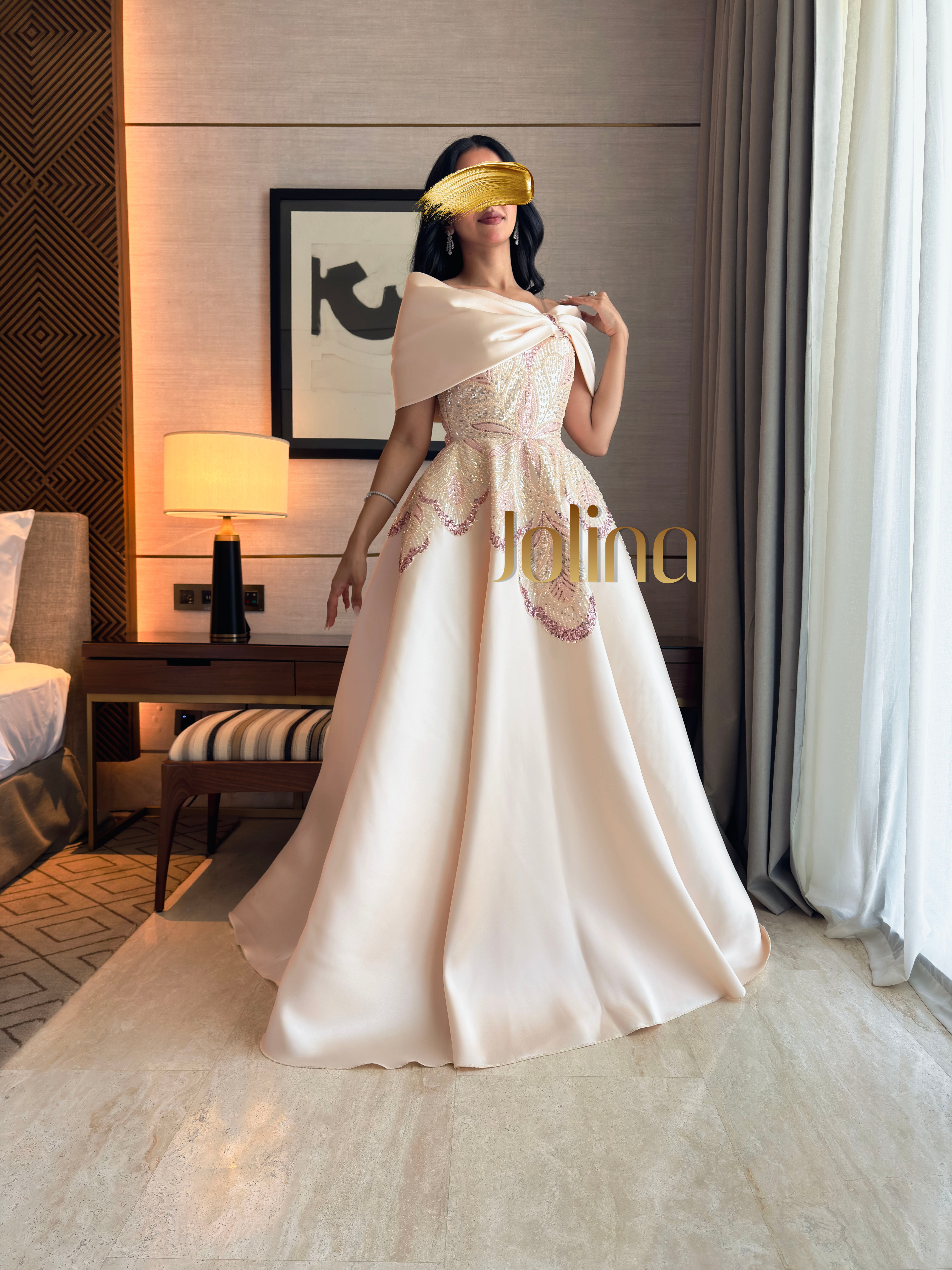 بتصميم Off-Shoulder يحتفي بأنوثتك، وتفاصيل تطريز تحاكي الفنون الشرقية بلمسة معاصرة، يناسب حفلات الزفاف والمناسبات الراقية، توقيعه الأنيق... من ذائقة جولينا.