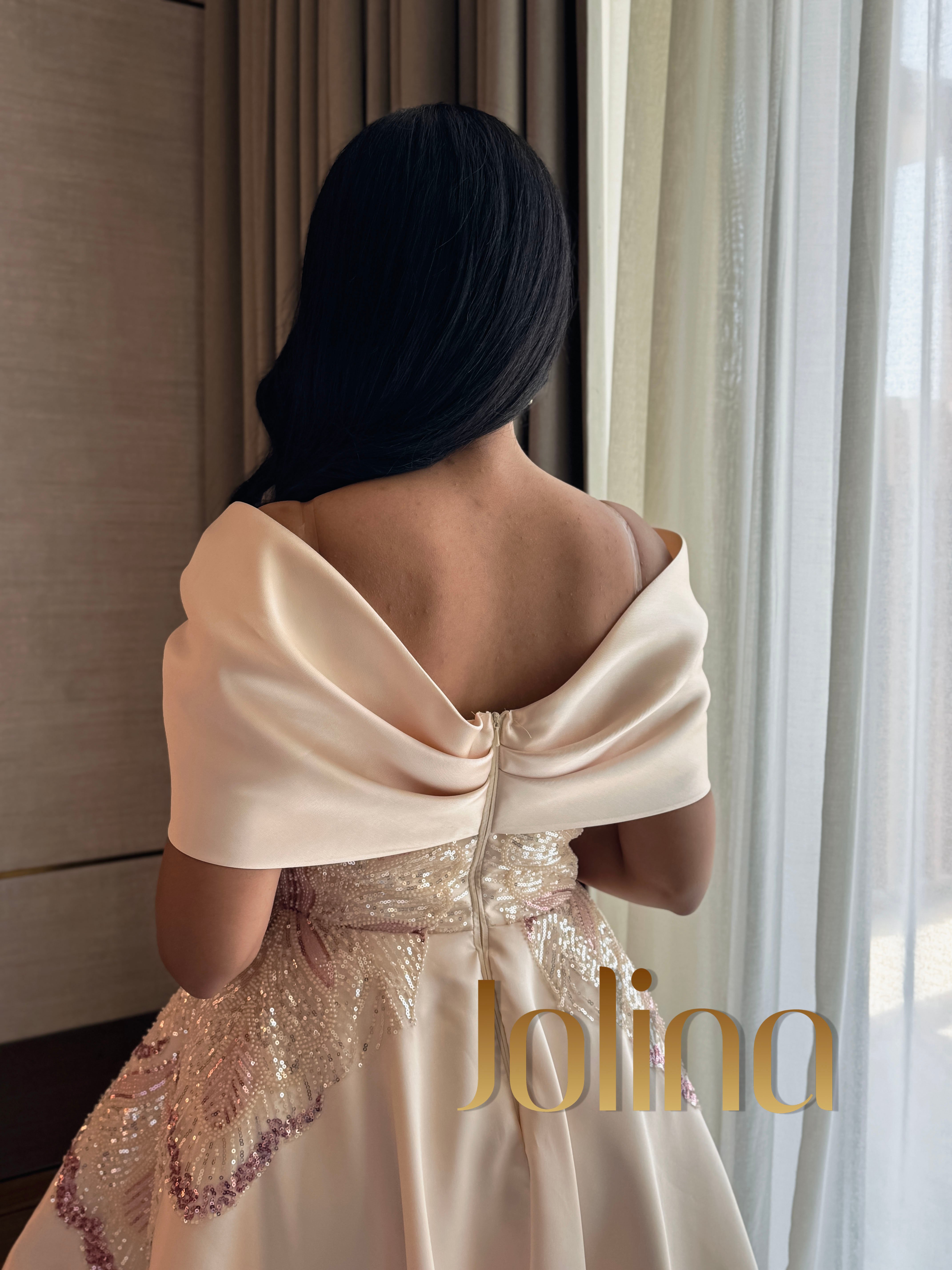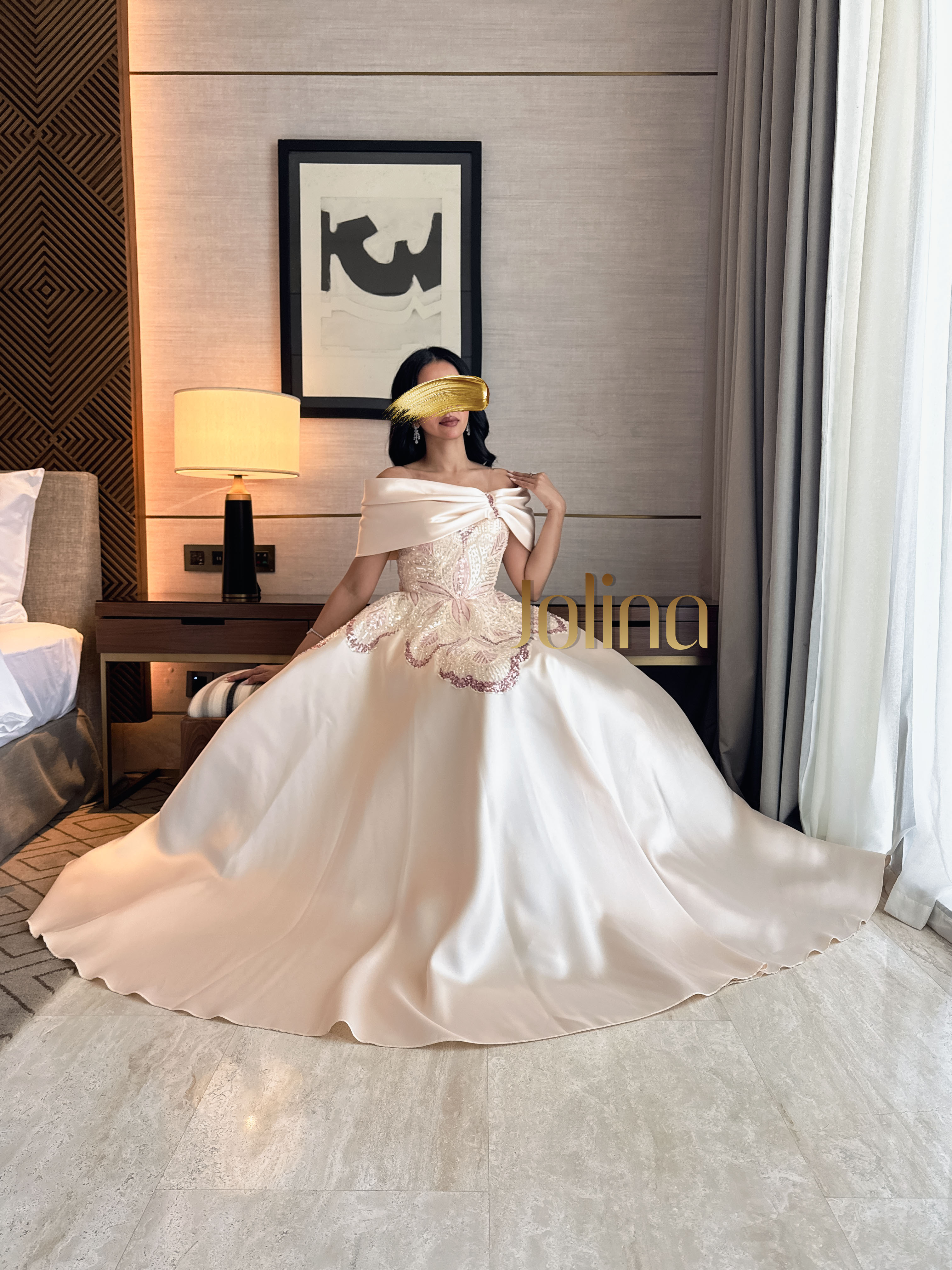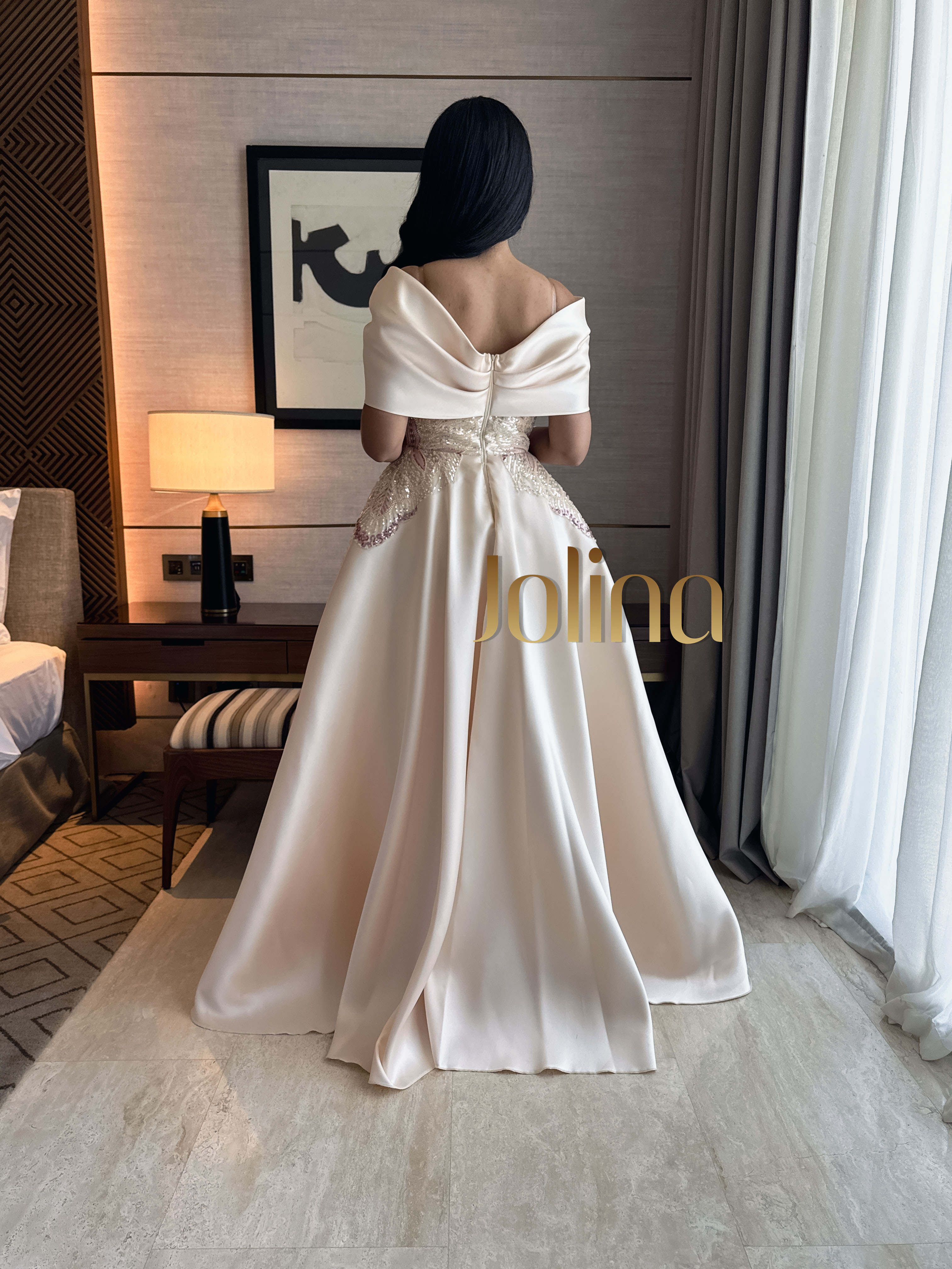 بتصميم Off-Shoulder يحتفي بأنوثتك، وتفاصيل تطريز تحاكي الفنون الشرقية بلمسة معاصرة، يناسب حفلات الزفاف والمناسبات الراقية، توقيعه الأنيق... من ذائقة جولينا.