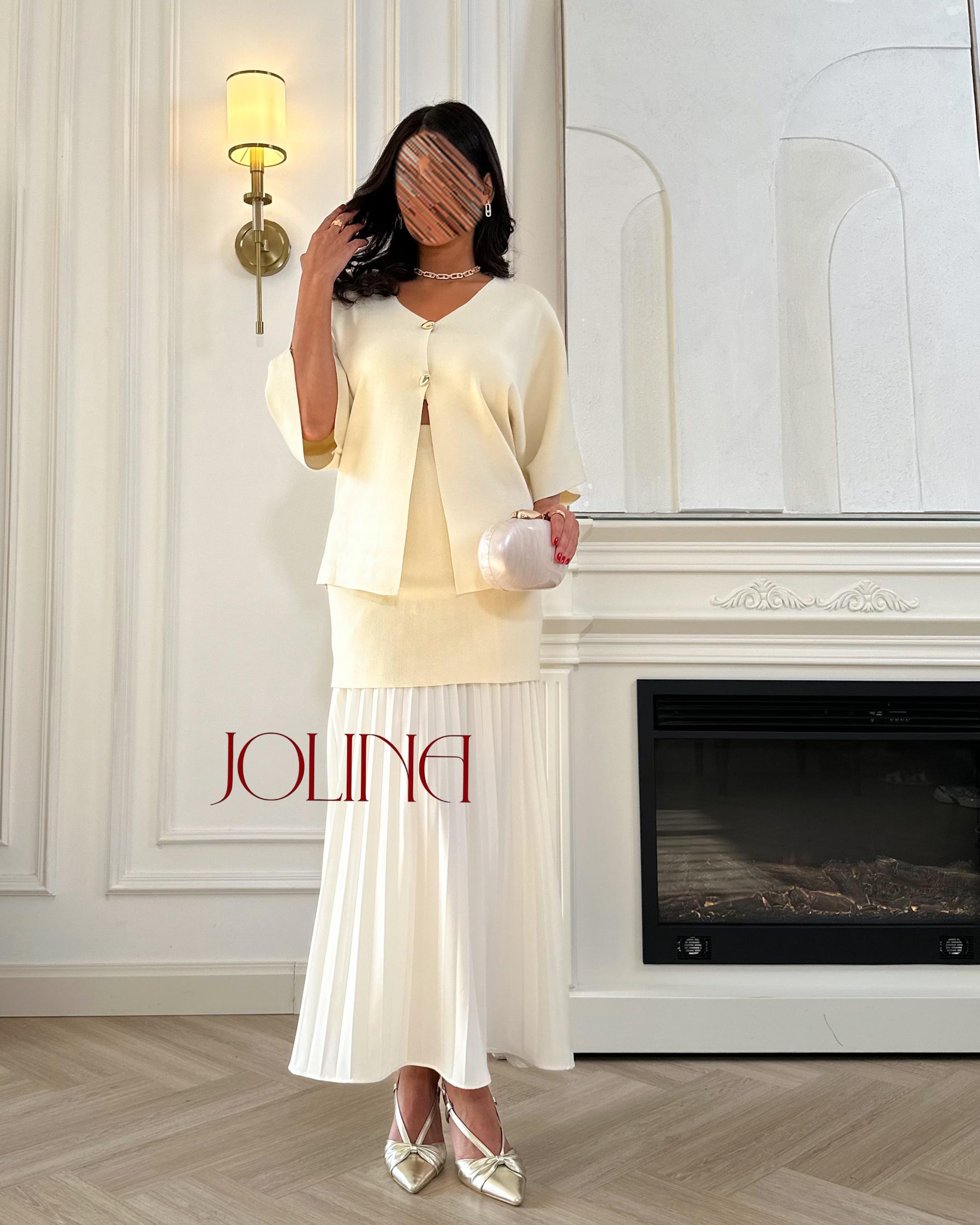 طقم بيج أنيق بتصميم ناعم وتنورة بليسيه