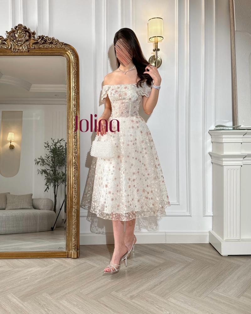 فستان ميهاد Rosavelle بالأبيض النقي، تتناثر عليه نقوش وردية فاتحة كهمس ربيع، بتصميم عاري الكتفين يفيض رقّةً وجاذبية.