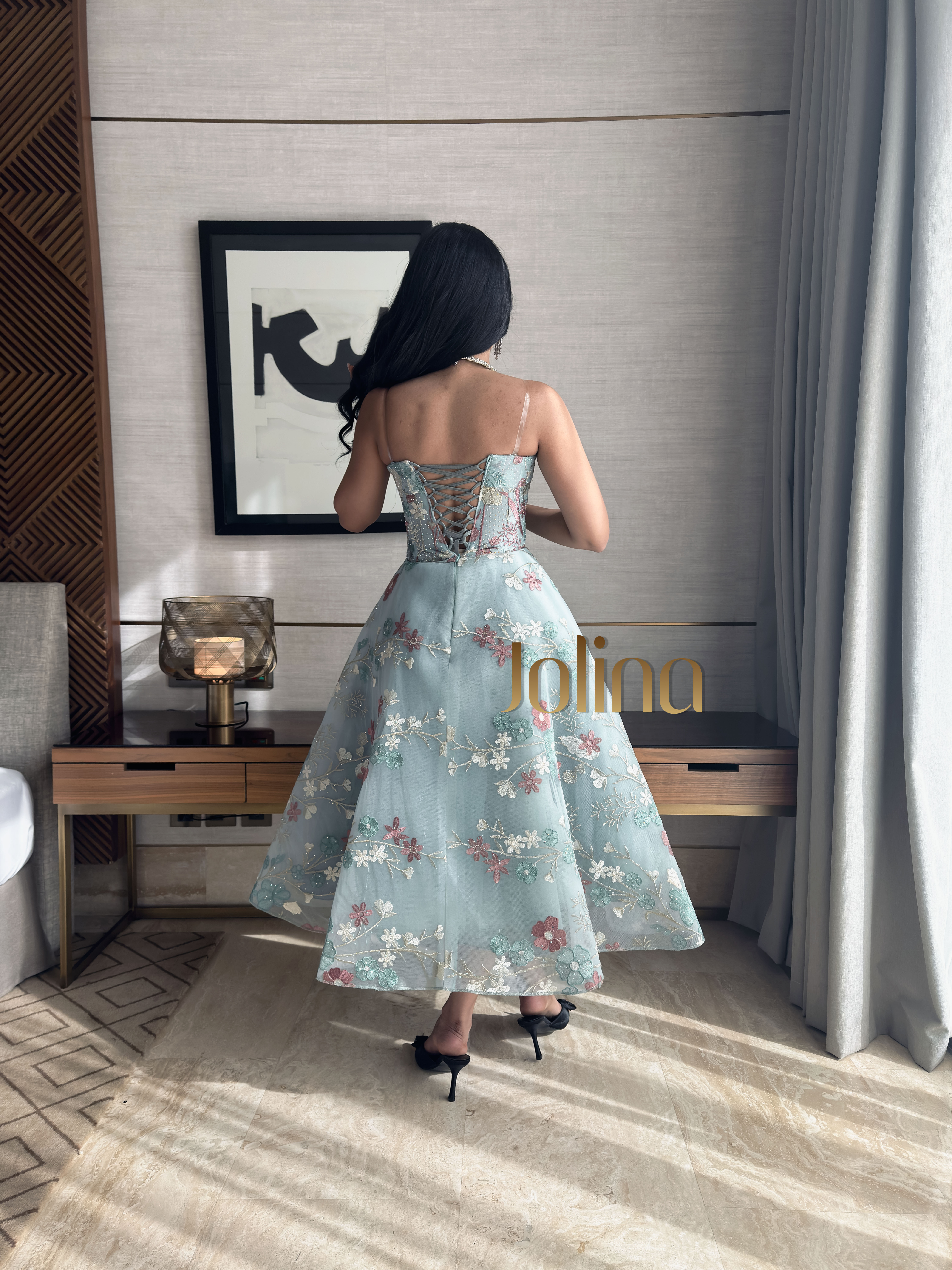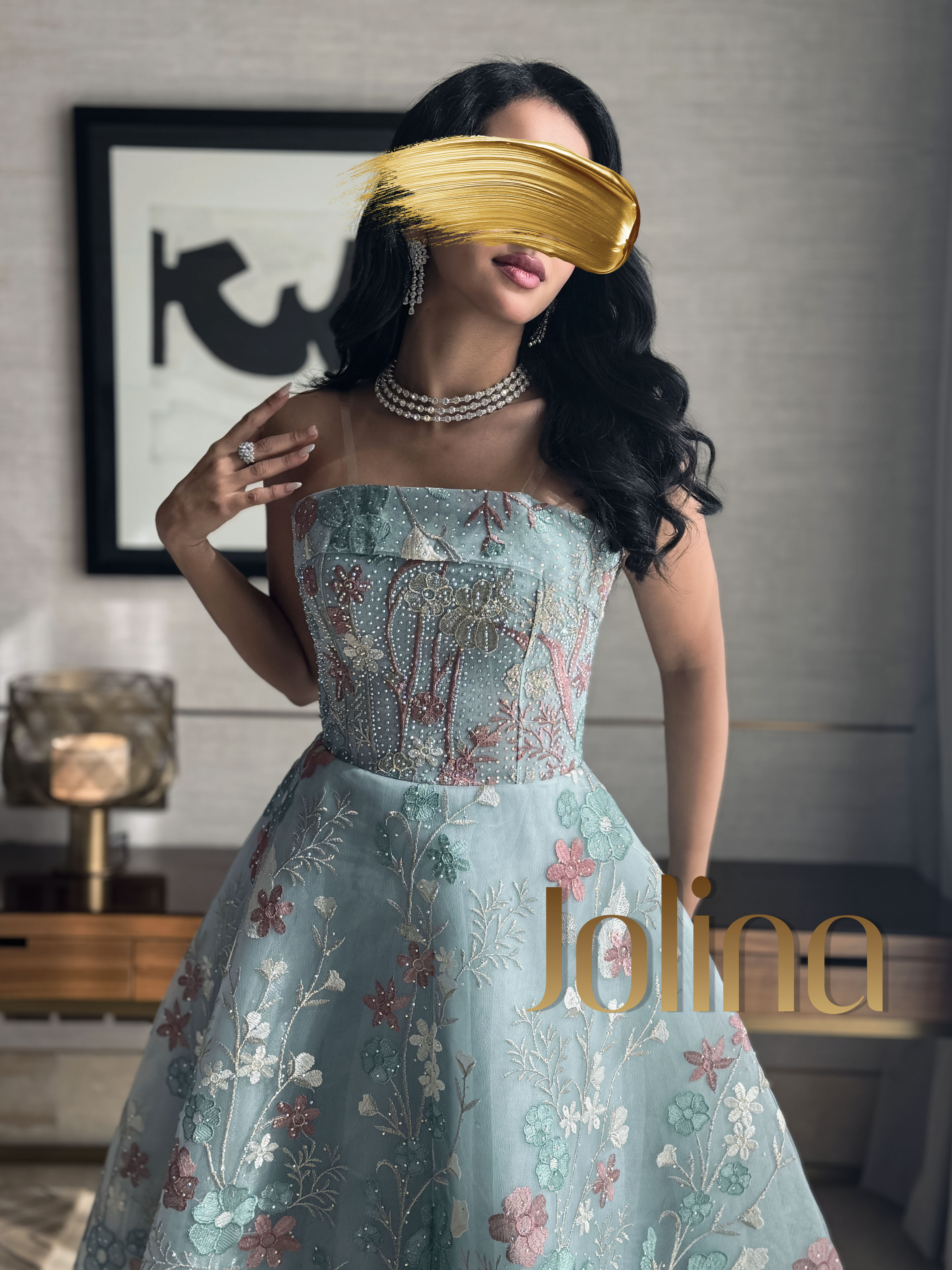 فستان طيف Fable بلونه الأزرق الفاتح يهمس برقّة، بقصة سترابلس تبرز الأكتاف وتحتضن تفاصيلك بترف. زخارف نباتية مطرّزة على قماش التل تضيف لمسة من الفانتازيا الفنية تلفت الأنظار دون صخب.
