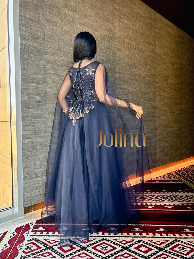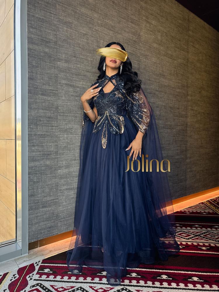 فستان سهرات كحلي بتول تايواني شفاف وتصميم شال مطرز يعكس أناقة خليجية ملكية. ملمس ناعم وانسيابي يمنحك حضورًا راقيًا في كل مناسبة وزواج.