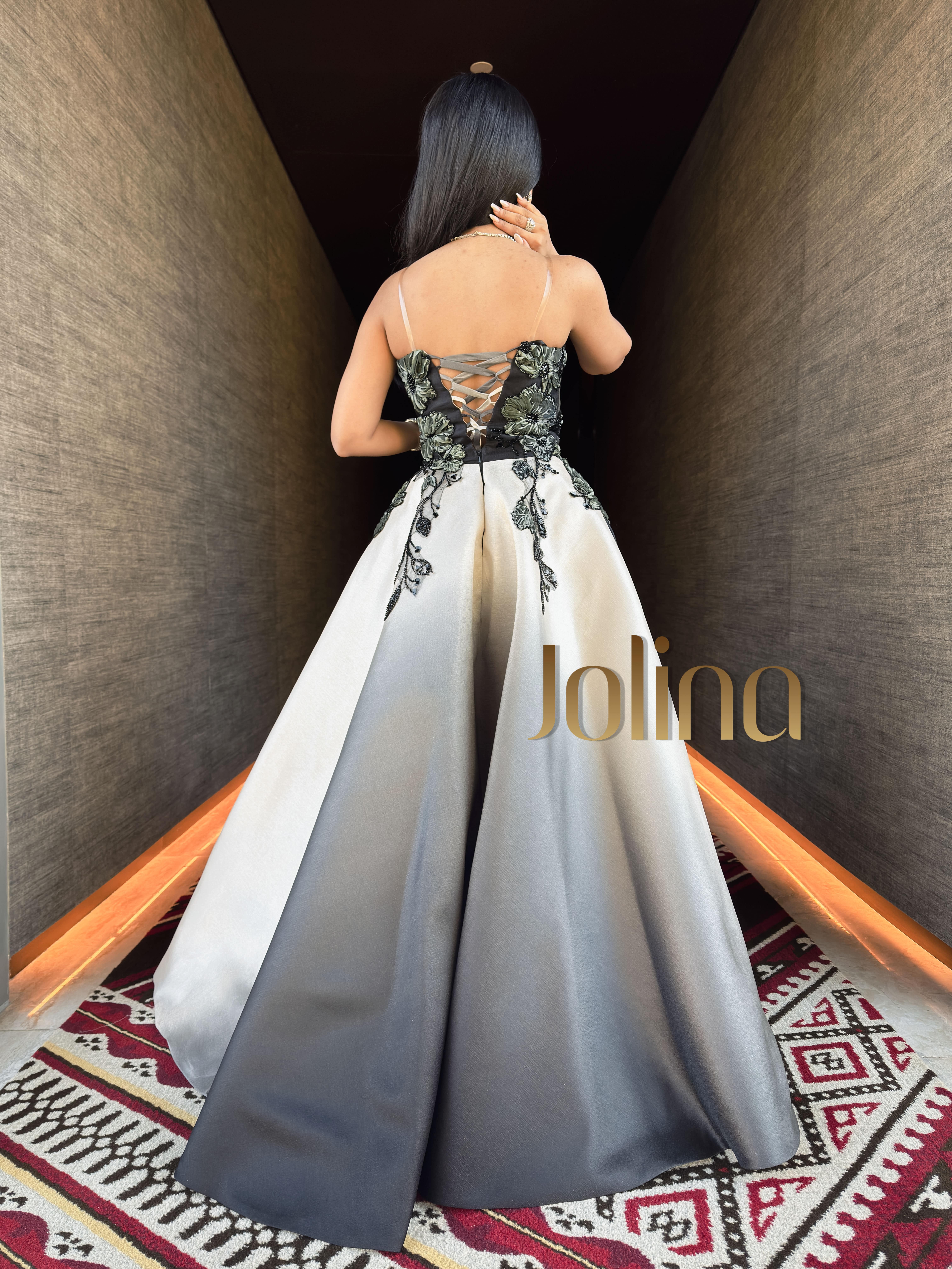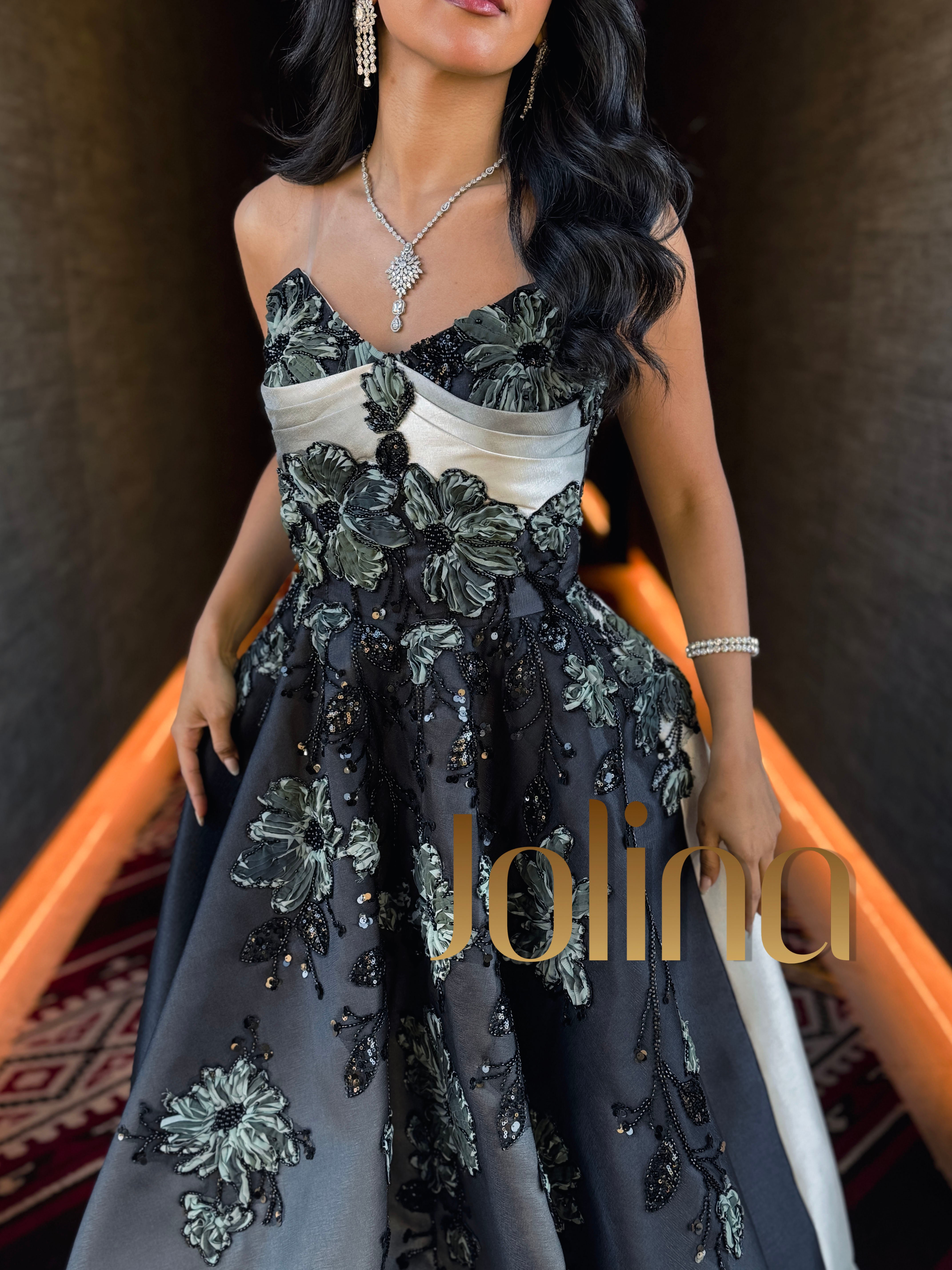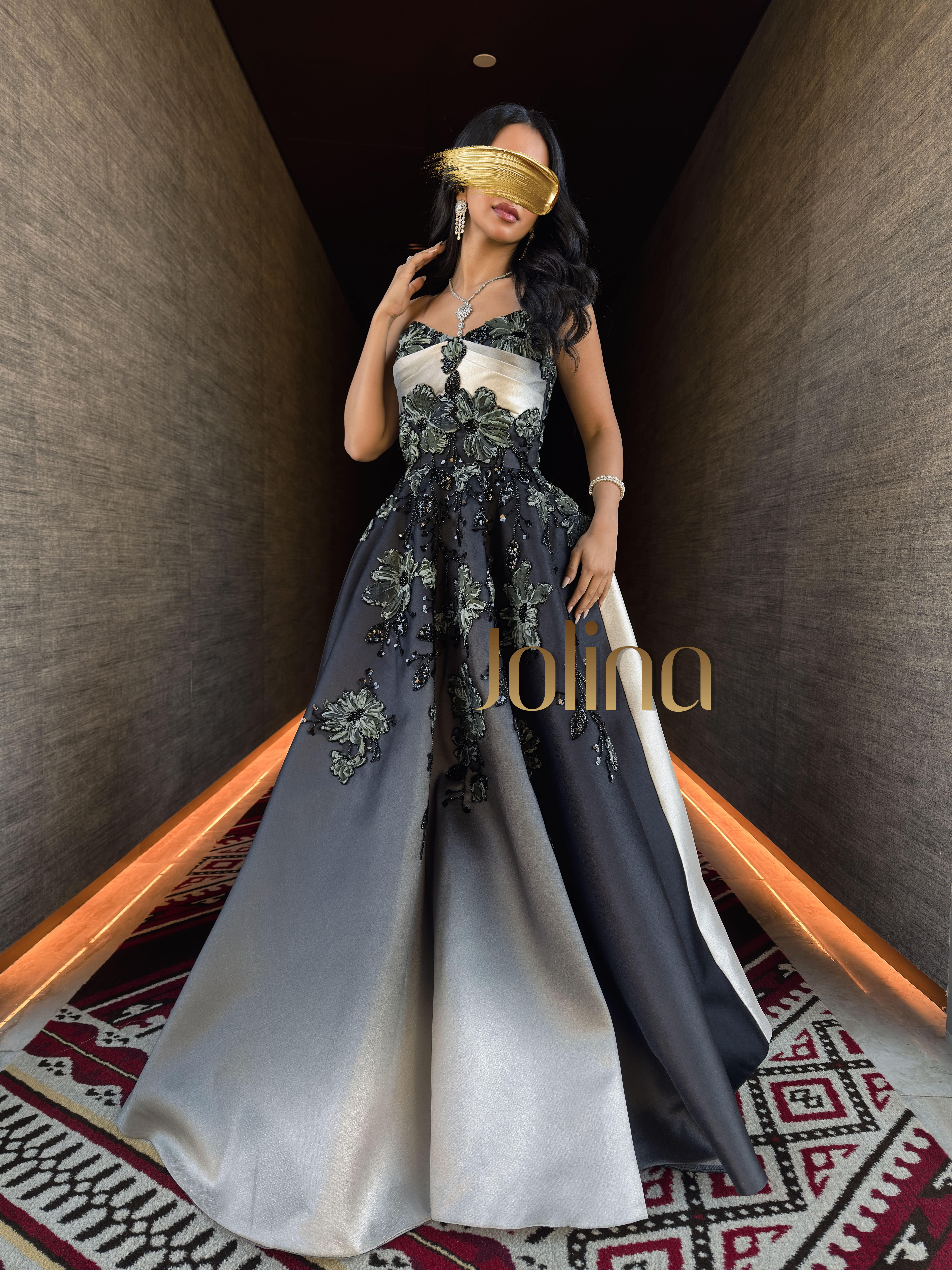 تصميمه الملكي الدبل كلوش مزدان بكلفة راقية تنسدل من الكتفين حتى الذيل، مستوحاة من زخارف القصور القديمة. مثالي لأمسيات العيد وسهرات الفخامة، يحمل توقيعًا صامتًا من لمسة جولينا التي تجيد رسم الحضور الهادئ المبهر.