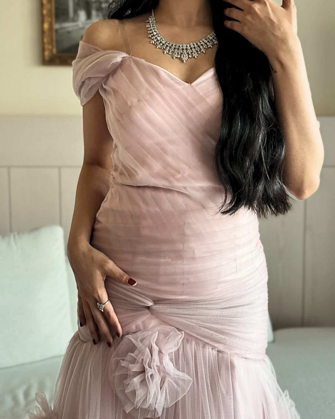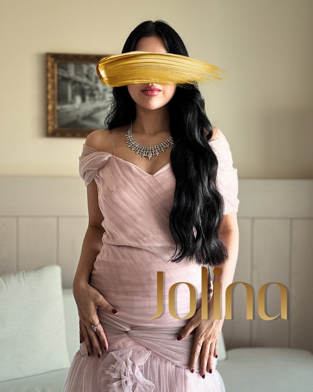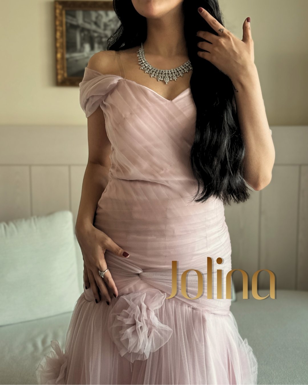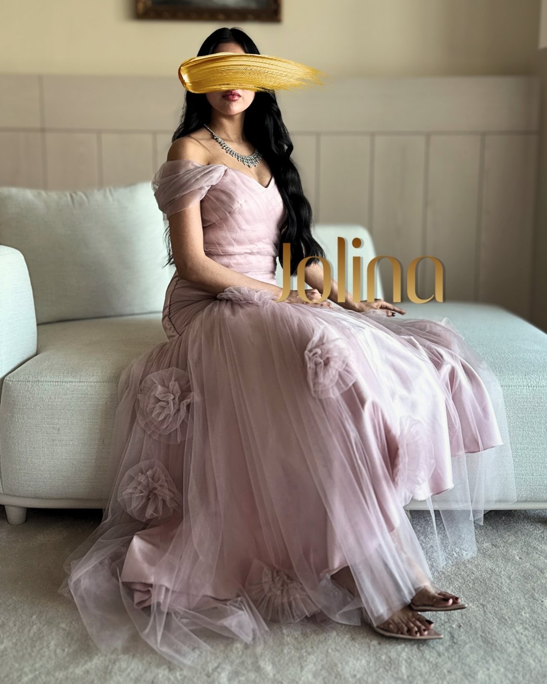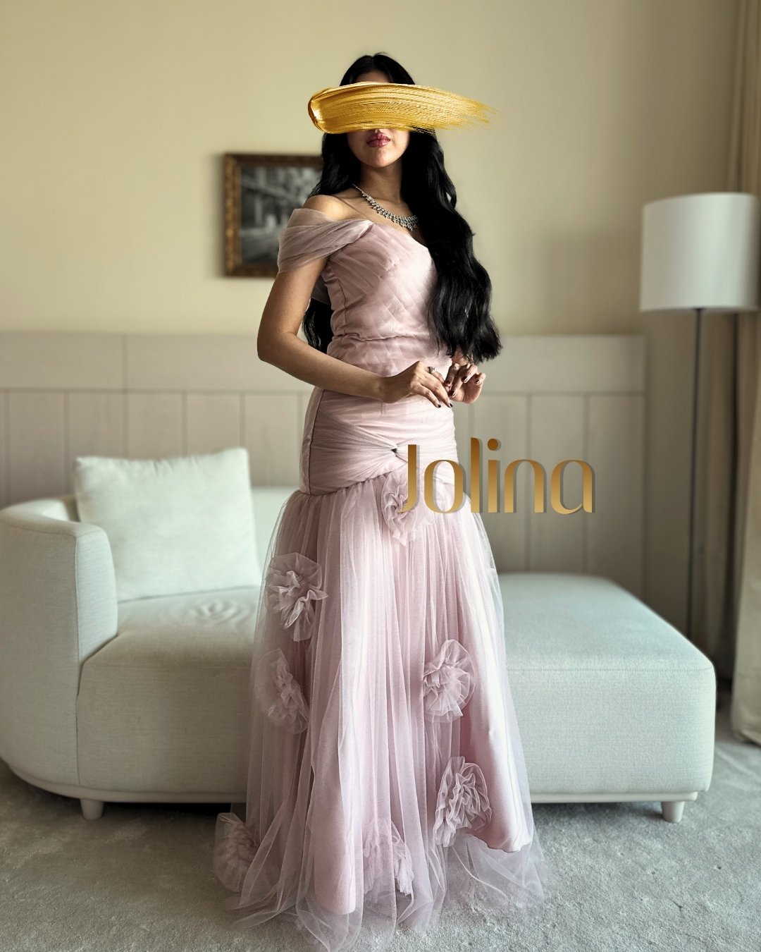 بتصميم Off Shoulder بكسرات دقيقة من الصدر حتى الخصر، تتناثر قصاصات ورد من التول فوق بطانة تفته كوري فاخرة، في مزيج راقٍ يُجسّد ذوق المرأة العربية في حفلات الخطوبة، الأعراس، والليالي الفاخرة… لمسة jolina في كل خيط.